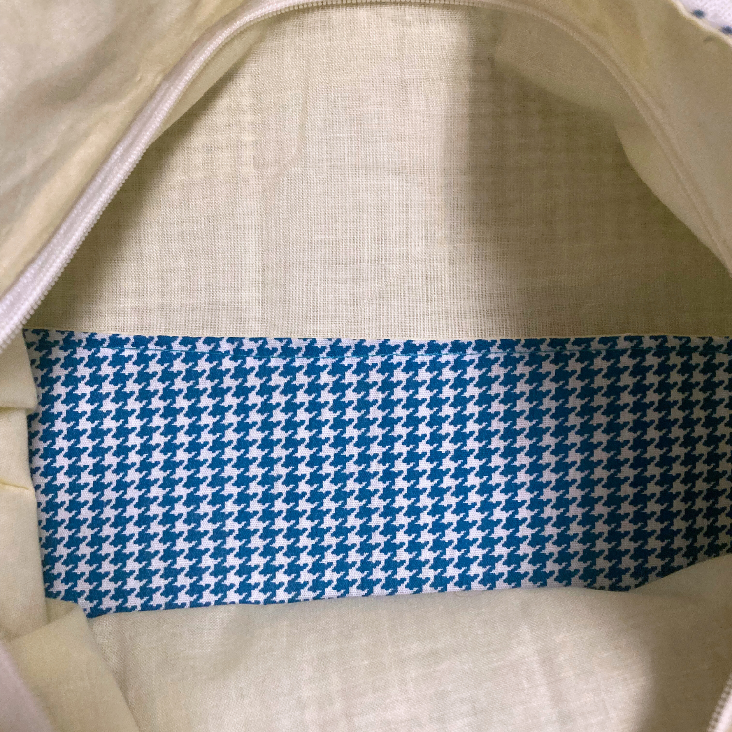 This lovely zippered patchwork tote bag is perfect to carry all your everyday needs. With a sturdy zipper at the top, all your belongings will be kept safe inside. This bag also has a large pocket on the inside for all miscellaneous, small items, like your keys and wallet, from getting lost at the bottom. The strap is long and sturdy, comfortable to wear. This bag measures at 14 1/2" by 14", and the strap is 44" long.