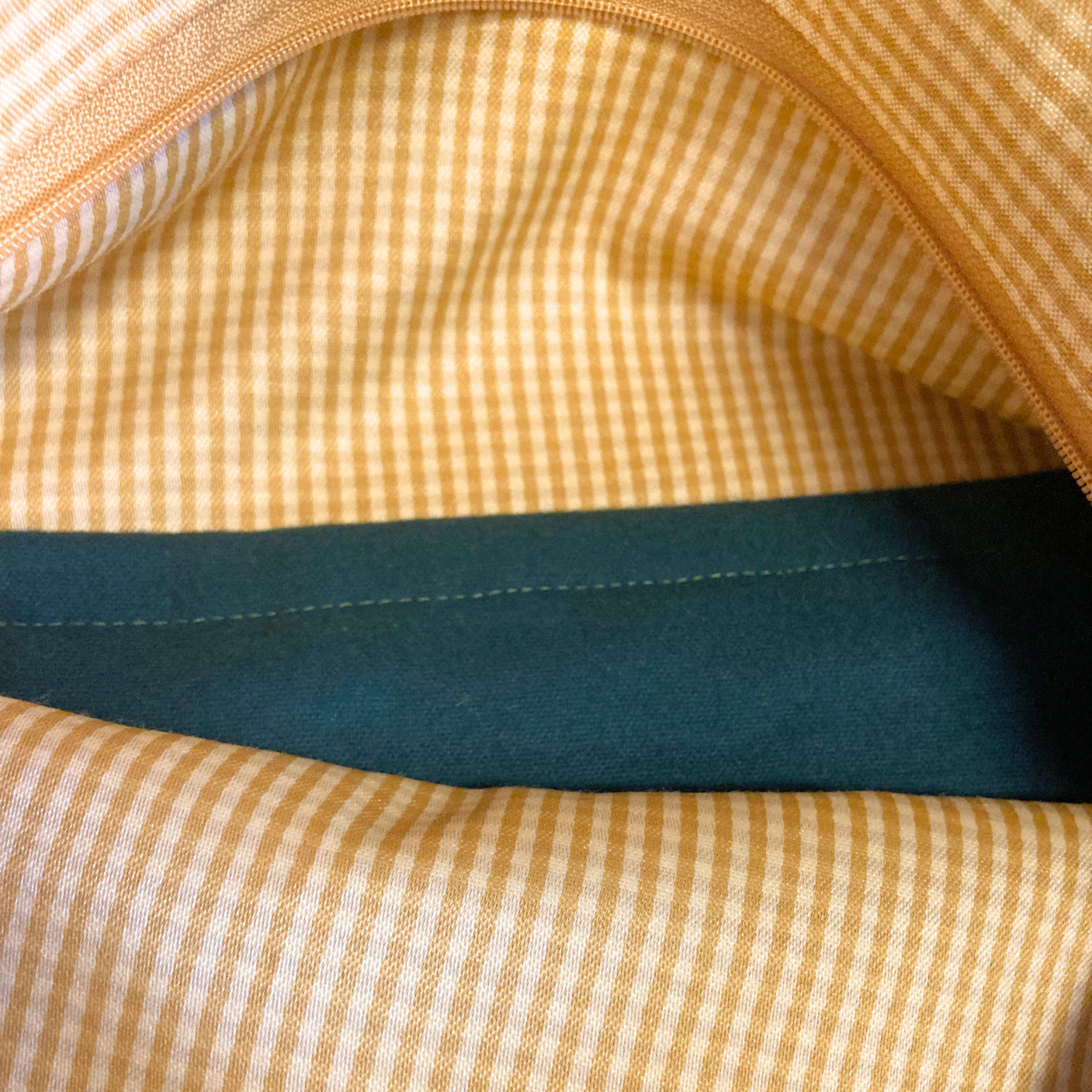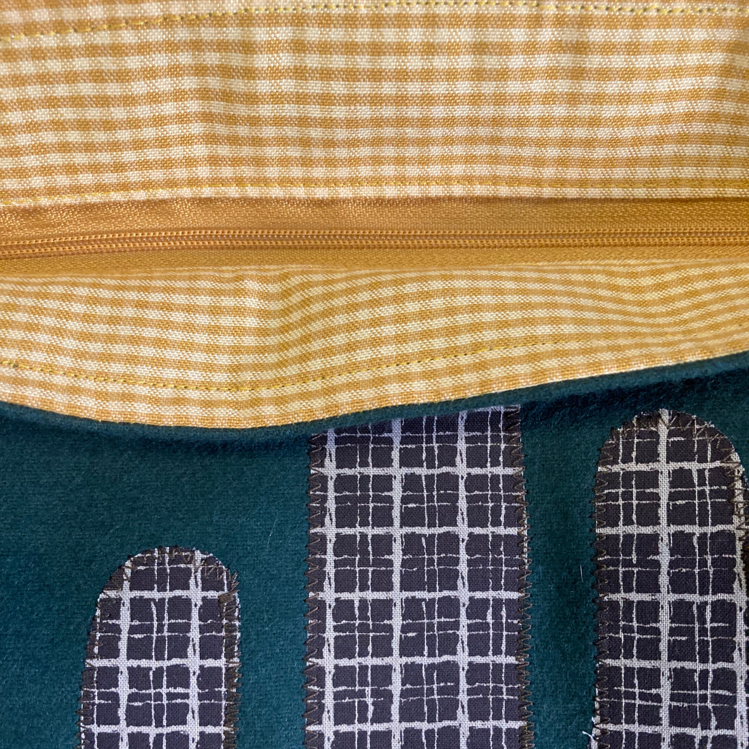 This lovely zippered patchwork tote bag is perfect to carry all your everyday needs. With a sturdy zipper at the top, all your belongings will be kept safe inside. This bag also has a large pocket on the inside for all miscellaneous, small items, like your keys and wallet, from getting lost at the bottom. The strap is long and sturdy, comfortable to wear. This bag measures at 14 1/2" by 14", and the strap is 44" long.