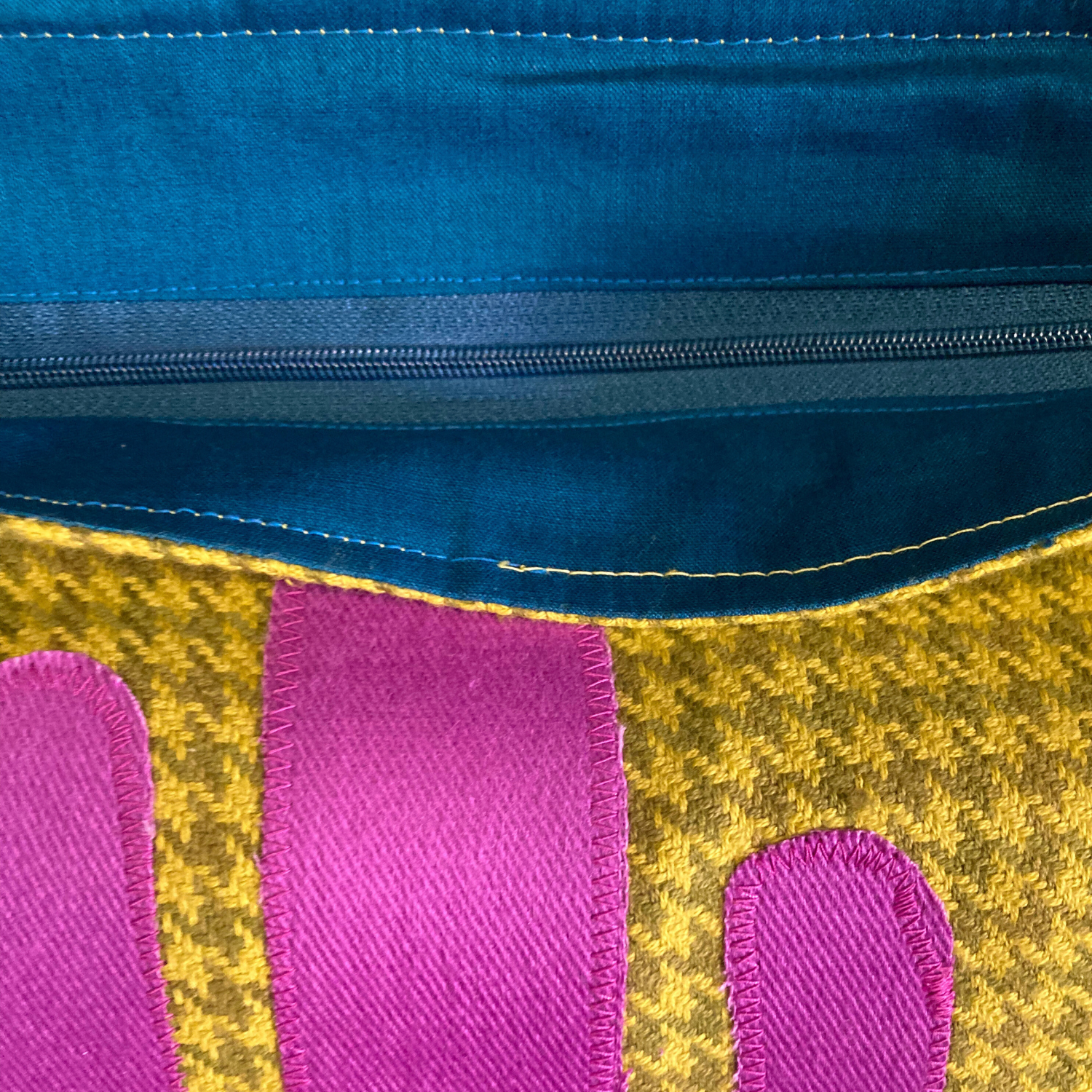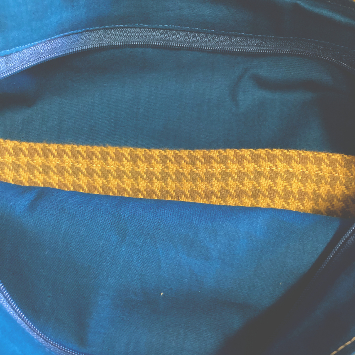 This lovely zippered patchwork tote bag is perfect to carry all your everyday needs. With a sturdy zipper at the top, all your belongings will be kept safe inside. This bag also has a large pocket on the inside for all miscellaneous, small items, like your keys and wallet, from getting lost at the bottom. The strap is long and sturdy, comfortable to wear. This bag measures at 14 1/2" by 14", and the strap is 44" long.