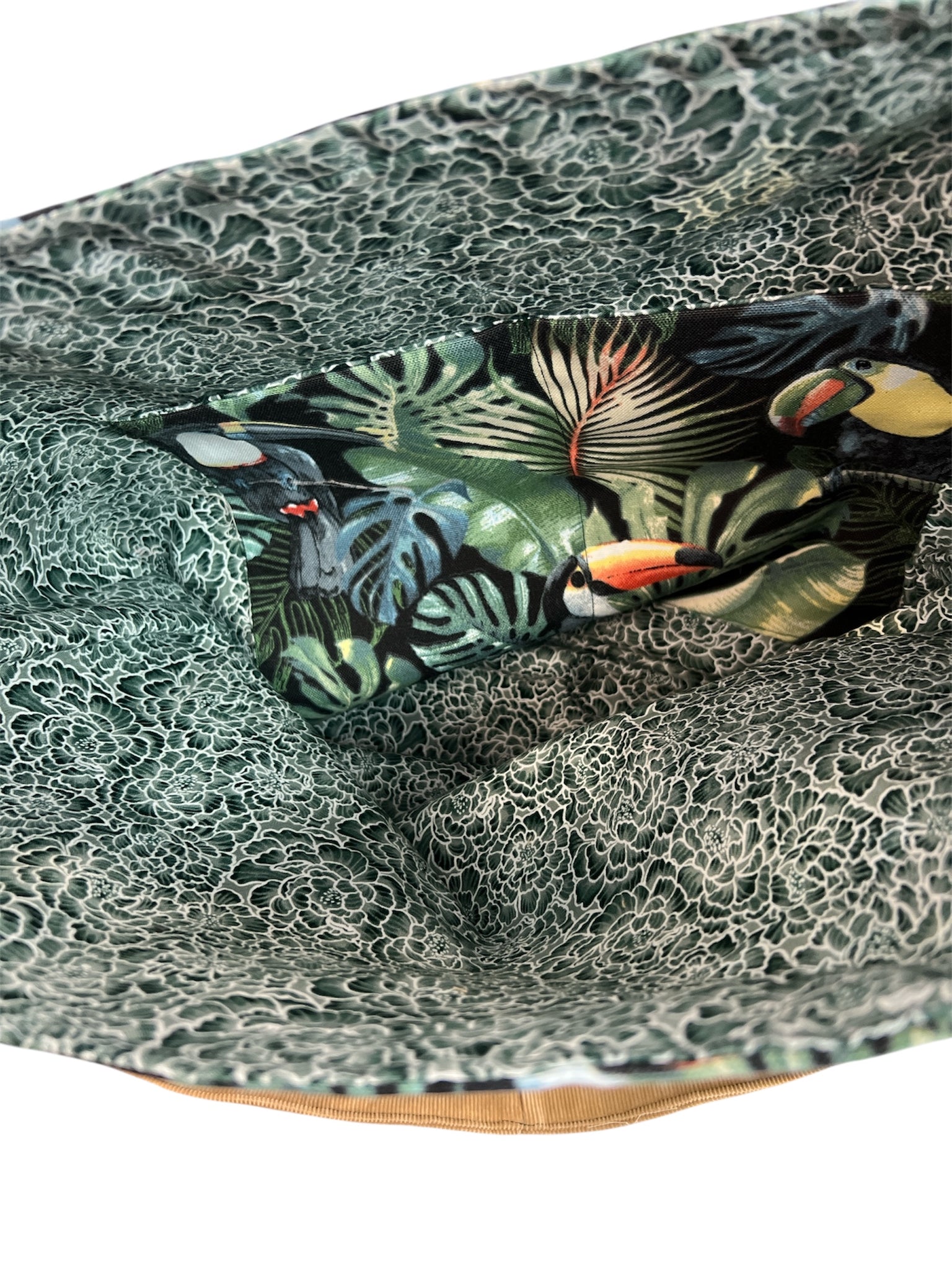 This lovely tote is perfect for carrying books or an afternoon at the pool. The bag's simple and functional design is great for work, school, and everyday use. The bottom boxed corners give support for heavier objects and the long, sturdy strap can be worn crossbody or casually on one shoulder. This bag is also reversible, giving you the option between two different patterns. The bag measures approximately 15 inches by 15 inches and has a large pocket on the inside. The strap is 40 inches in length.